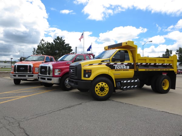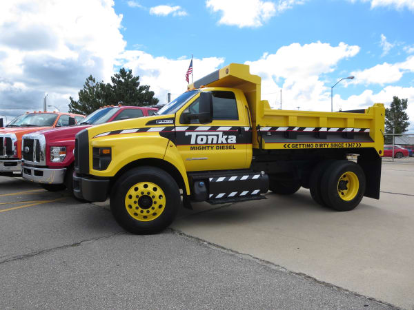The Tonka Truck-themed F-750 dump is a one-of-a-kind vehicle with graphics approved by the toy maker. No others will be built, Ford says.