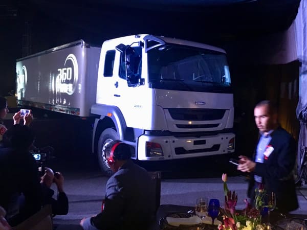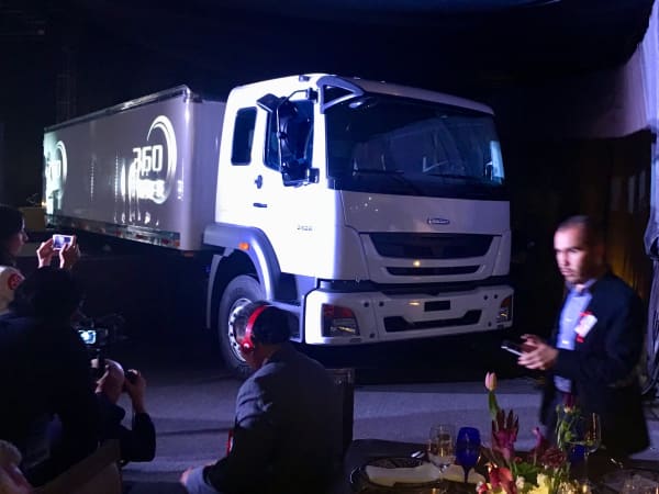 Daimler gave a sneak preview to its customers the night before its presser of its two new cabovers-- a Class 6 and a Class 8-- for its Mexico-specific Freightliner 360 line. Photo: David Cullen