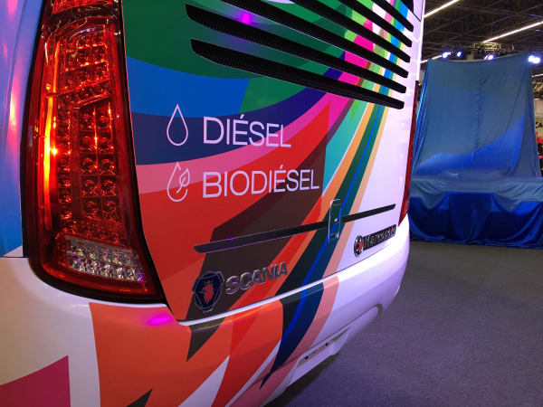 Here's a motorcoach from Scania that's happy running on diesel fuel or biodiesel.