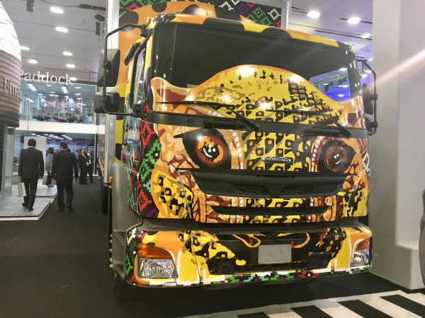 Lurking in the Freightliner booth is a jungle-cat motif 2528, the new Class 8 in the 360 family of Mexico-specific cabovers. Photo: David Cullen