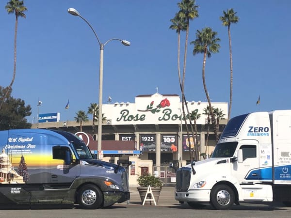 T680 Next Gen Christmas tree truck and T680 fuel-cell-electric truck together at the Rose Bowl in Pasadena, California.