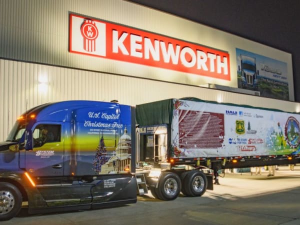 A Kenworth T680 Next Generation operated by System Transport and built by employees at Kenworth’s manufacturing plant in Chillicothe, Ohio, returned to the plant on its way to deliver the Capitol Christmas Tree.