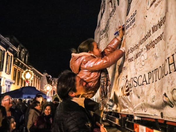 A child autographs the side of the Christmas tree truck in Williamsport, Maryland.