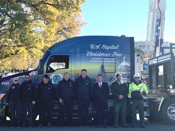 From left are Nancy Henderson, U.S. Capitol Christmas tree project manager, Six Rivers National Forest; Rob Heskett, System Transport chief operating officer; Bill Brunk, System Transport driver; Jeremy Bellinger, System Transport driver; Dennis Williams, System Transport CEO; J. Brett Blanton, architect of the Capitol; Ted McArthur, forest supervisor, Six Rivers National Forest; and Jim Kaufmann, director of the Capitol Grounds and Arboretum.