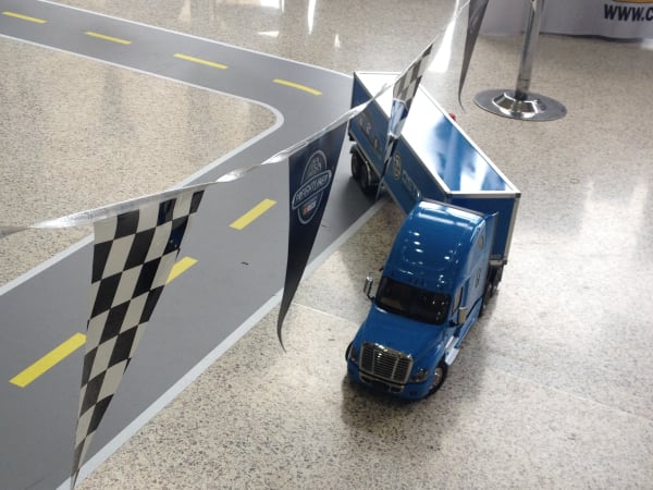 One "driver" of a remote controlled Freightliner truck couldn't keep it on the highway.