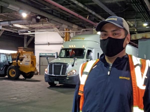 Truck driver Mark Sain uses a bandana as a face covering to help slow the spread of COVID-19.