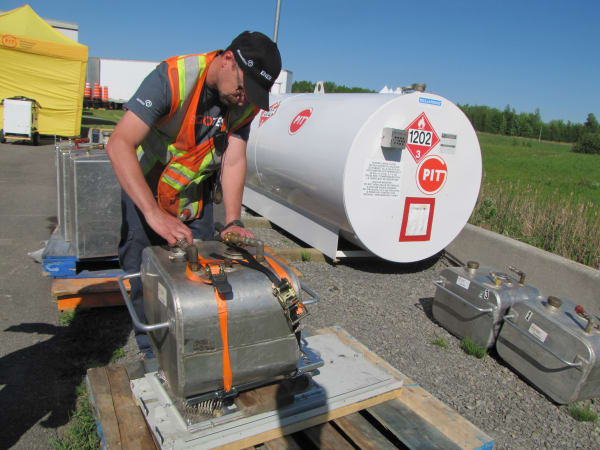 Steve Mercier, PIT Group engineer, fueling up auxiliary tanks that are used to accurately measure fuel consumption during Energotest runs.