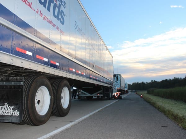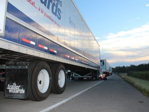 Trucks line up for testing of various combinations of engines and automatic transmissions at PIT Group's spring Energotest rolling laboratory event in Québec.