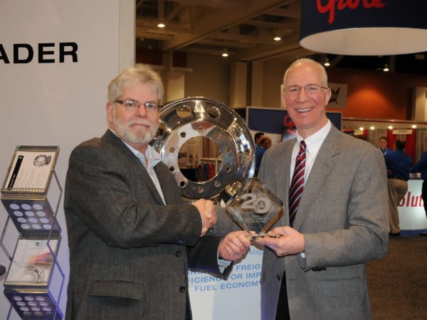 Alcoa was a Top 20 Product winner for what it says is the world’s lightest heavy-duty truck wheel, the Ultra One with Magnaforce alloy. HDT's Equipment Editor Jim Park, left, with Alcoa's vice president of sales and marketing Todd Hershberger.