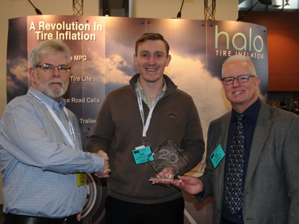 Josh Carter, co-founder and CEO of Aperia Technologies accepting his award. Aperia won for its Halo Tire Inflator, which uses the wheel’s own rotational motion.