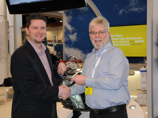 Equipment Editor Jim Park presents Tony Truelove, North American truck marketing communications manager, an award for the Procision transmission for medium-duty.