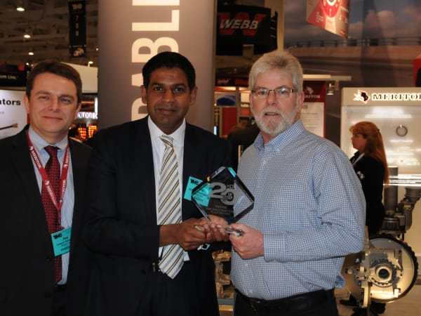 Meritor Americas' Joe Elbehairy(left), vice president of engineering and quality and president Chris Villavarayan, center, accept award from Equipment Editor Jim Park for Meritor’s P600 Series planetary axles, engineered for heavy-haul, oil field, logging and mining applications.
