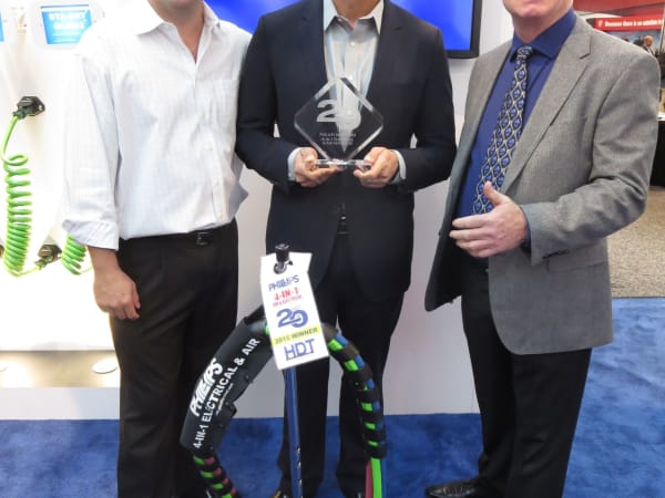 Phillips Industries introduced 4-in-1 combination electrical and air assemblies with liftgate and auxiliary cables with multiple plug and seal options. David Phillips on left and Rob Phillips in the middle.