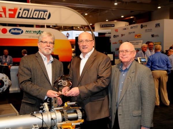 Allison Transmission won for its new series of FuelSense fuel efficiency features. HDT's Al Brunelli, left, Lou Gilbert, director of North American marketing and global brand development for Allison, and Senior Editor Tom Berg, right.