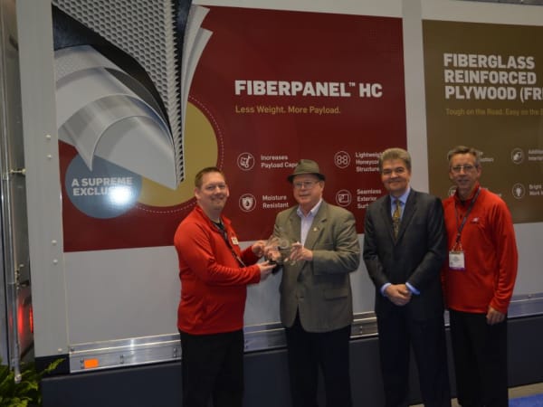 Rob Taylor, general manager of Tower Structural Laminating, left, HDT Senior Editor Tom Berg, HDT Publisher Dave Moniz and Mark Weber, president at Supreme. Supreme Corp. won for its FiberPanel HC, A lightweight honeycomb sidewall design on straight truck bodies.