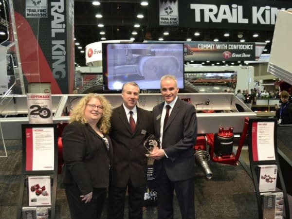 Editor in Chief Deborah Lockridge presents award to David McCleave, director of marketing and aftermarket, truck commercial vehicle systems at Hendrickson, (Middle), and Matt Joy, vice president, and general manager, truck commercial vehicle systems, for the OptiMaax 6x2 forward axle.