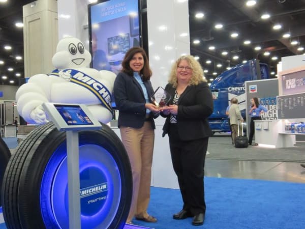 Michelin U.S. Marketing Manager Bianca Hogan accepts award from Editor in Chief Deborah Lockridge for the X Multi Energy Z tire.