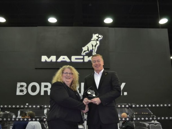 John Walsh, vice president of marketing for Mack, accepts award from Editor in Chief Deborah Lockridge for the MP8 505C+ engine.