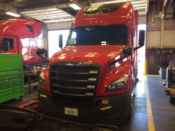A new Freightliner Cascadia awaits its fuel test run at US Xpress headquarters in Chattanooga, TN.