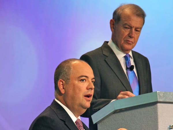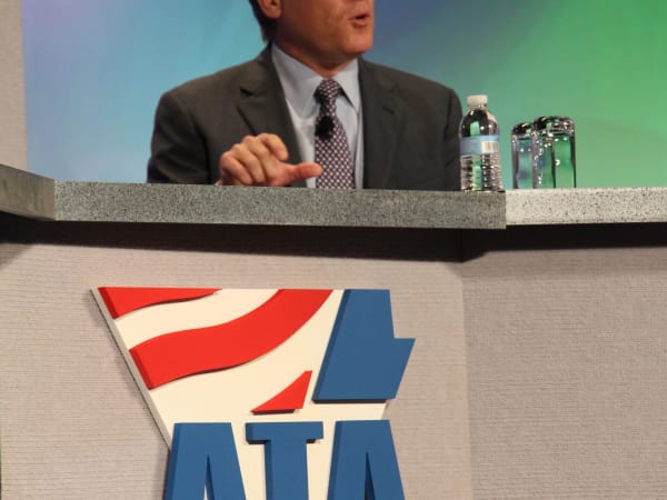 ATA Chief Economist Bob Costello, left, speaking at the "Eyes on the Economy" panel, while Fox Business News' Stuart Varney moderates.