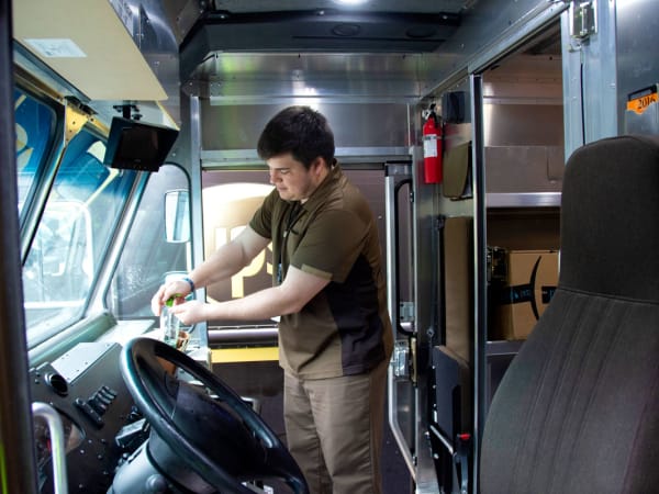 A UPS drivers uses hand sanitizer.