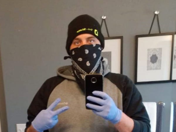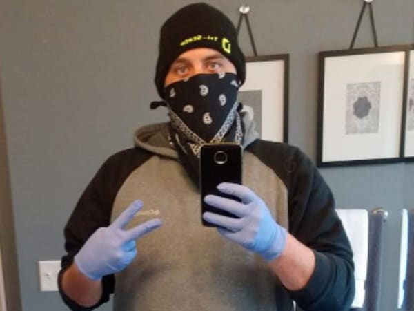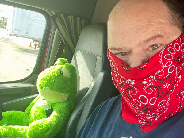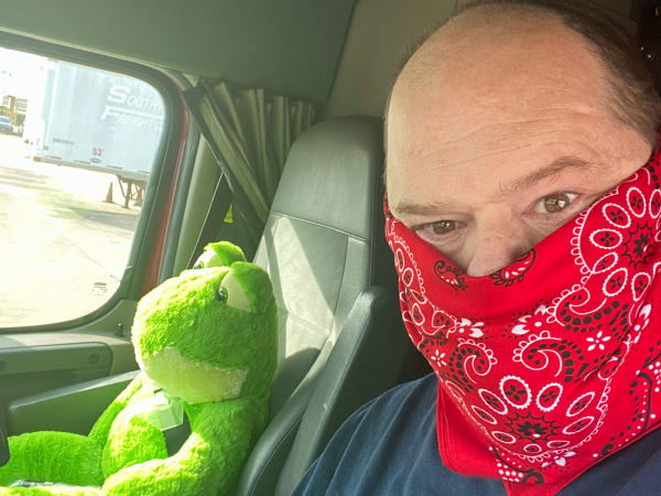 Driver Jack McFadden with the Roadmaster Group uses what he can for a face mask as recommended by the CDC.