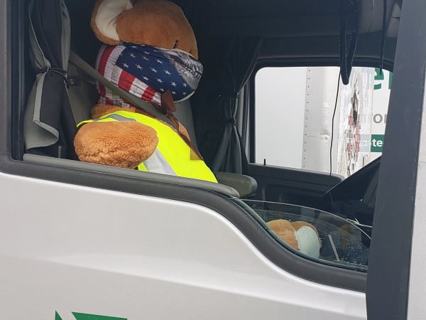 This teddy bear riding shotgun not only has his safety vest on, but also a mask to protect against COVID-19.