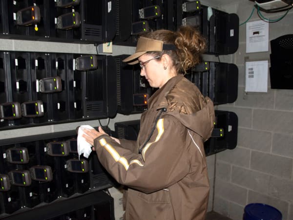 A UPS driver disinfects Delivery Information Acquisition Devices, or DIADs.