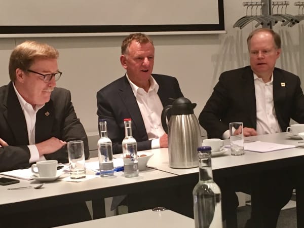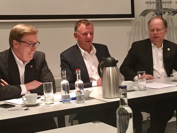 Navistar CEO Troy Clarke, VW Truck CEO Andreas Renschler, and Navistar CFO Walter Borst field queries from the press at IAA. Photo: David Cullen