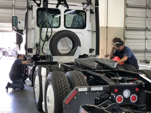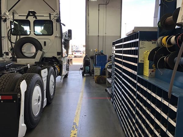 On the trailer side of SwiftTech, a technician looks at a Thermo King refrigerated unit.