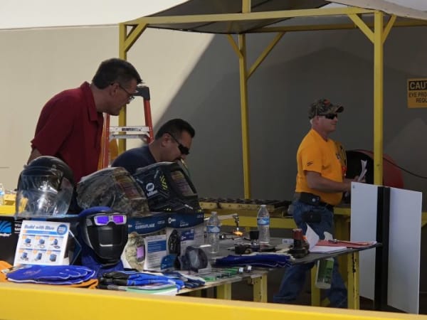A technician demonstrates welding skills with a torch as a judge watches closely.