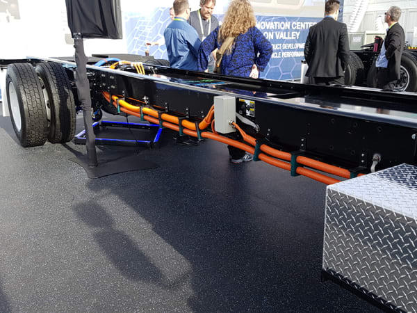 High-voltage cable supplies power from the frame-mounted batteries to the axle-mounted motors on the Peterbilt Model 220 EV. The frame and back of cab are "clean" so body builders will not have to make any adjustments to their installation processes.