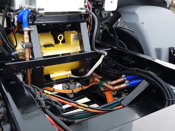 Space formerly occupied by the engine on the Model 220 EV now houses electric motors for the air compressor, power steering pumps and other subsystems.