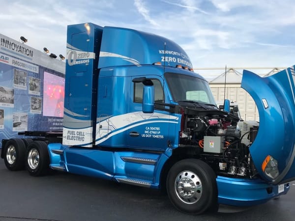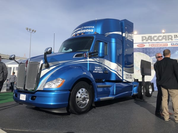 The Kenworth truck uses two Toyota Mirai fuel cell stacks and a battery generating enough energy for the truck’s electric drive system to deliver 670 horsepower and 1,325 pound-feet of torque. (Previously, Kenworth had demonstrated a hydrogen fuel cell truck powered by a Ballard fuel cell.)
