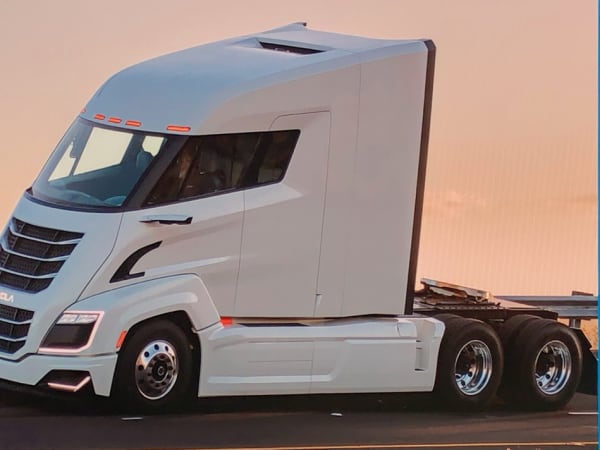 One of Nikola's stock shots of the Nikola Two. The cutaway on the roof is part of the fuel-cell cooling system.