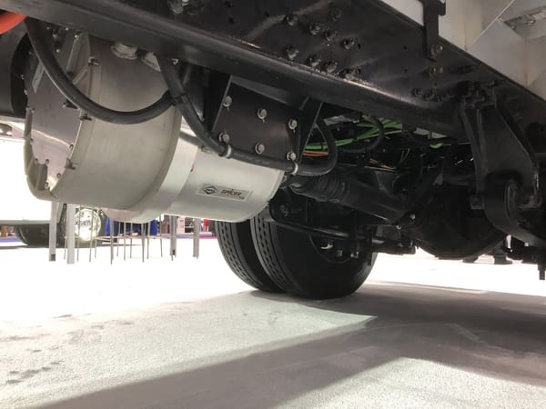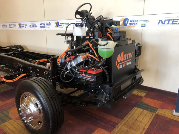 A Class 5 chassis from Motiv, body removed, showing the powertrain components and control systems. Batteries are stowed along the frame rails and behind the rear axle