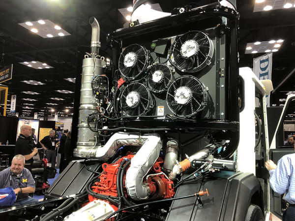 To reduce in-cab noise and heat from the engine, Crane Carrier's LNT places the cooling system and fans behind the cab.