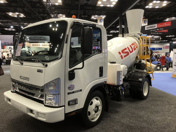 Isuzu NPR with a concrete mixer chassis.