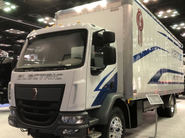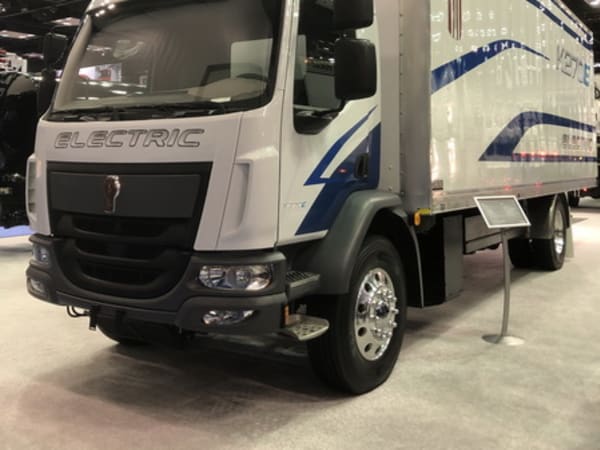 Kenworth's K207E battery electric Class 6 features a 355-hp Dana TM4 e-Motor. It has a 100-mile range with 9-hour AC charging and 1 hour DC fast charging up to 80%.