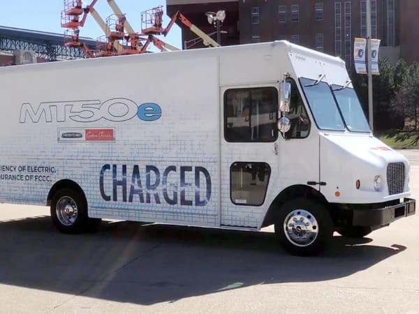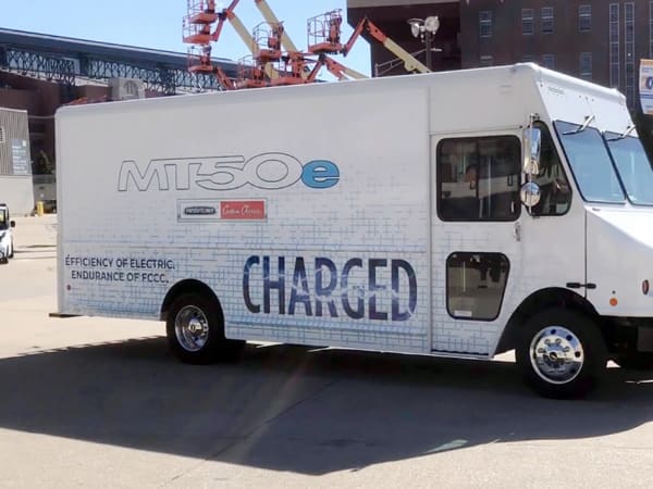 Freightliner Custom Chassis Corp.'s new all-electric MT50e walk-in is equipped with Proterra's 226 kWh battery system for a range of more than 125 miles with DC fast charging capability in three hours.