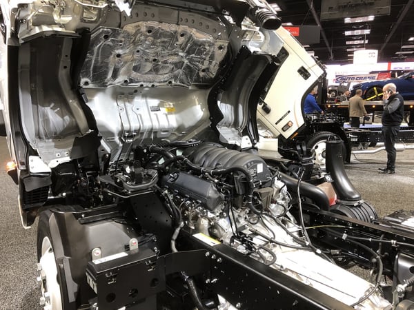 A Class 4 Isuzu NPR HD cab tilted up revealing the new 6.6L V8 gasoline engine introduced this year to avoid the cost and complexity of pending Low-NOx emissions regs for diesel engines.