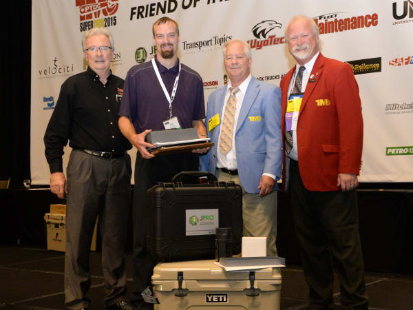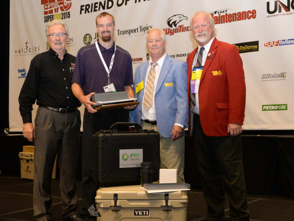From left: George Arrants, chairman of TMC's technician competition task force; FedEx Freight's Eric Vos, TMCSuperTech 2015 champion; Mike Meredith, chairman of TMC's Protessional Technician Development Committee; and Kevin Tomlinson, TMC general chairman. Photo: TMC