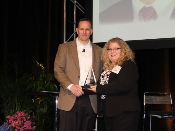 Mike O'Connell accepts his HDT Truck Fleet Innovator award from Editor in Chief Deborah Lockridge at the Mid-America Trucking Show Fleet Forum.
