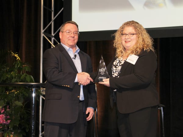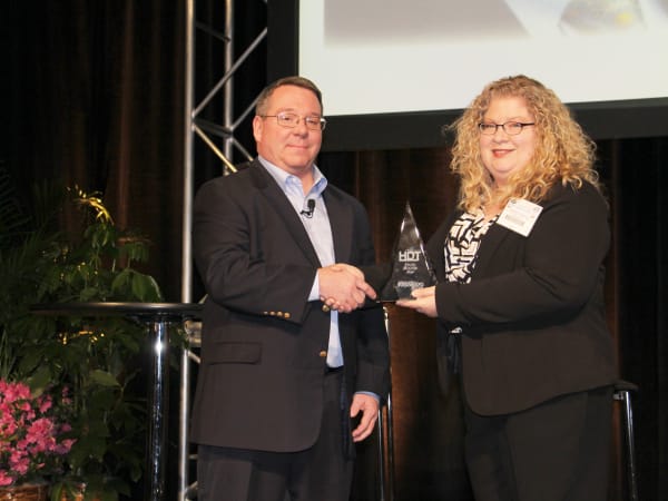 David Hoover accepts his HDT Truck Fleet Innovator award from Editor in Chief Deborah Lockridge at the Mid-America Trucking Show Fleet Forum.