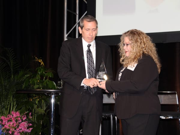 Shelby Green accepts his HDT Truck Fleet Innovator award from Editor in Chief Deborah Lockridge at the Mid-America Trucking Show Fleet Forum.
