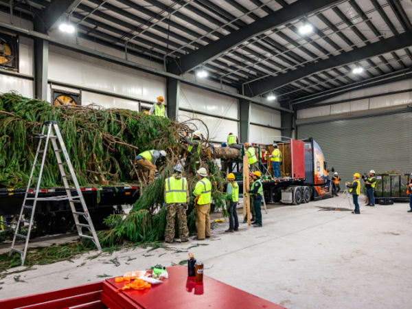 The official Christmas tree is unloaded in front of the U.S. Capitol.