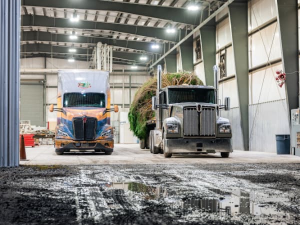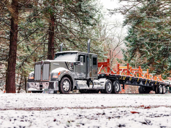 Equipped with a 52-inch flat-roof sleeper, MX-13 engine rated at 510 horsepower, and a Paccar TX-18 transmission, the Kenworth W990 hauled the Christmas tree down 14 miles of forest service roads.
