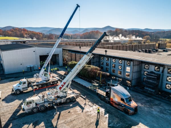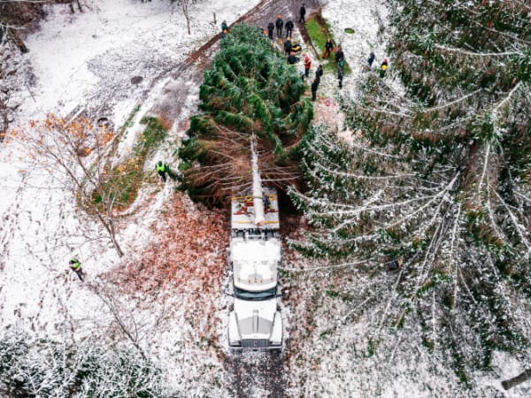 Cranes move the Christmas tree.