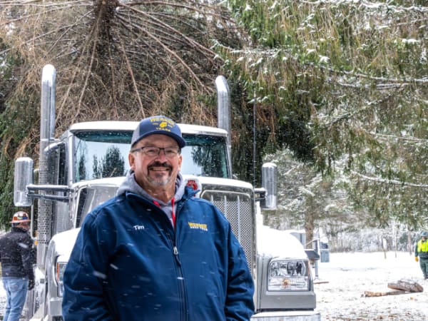 Werner Enterprises' Tim Dean is shown at the site where the tree was harvested.