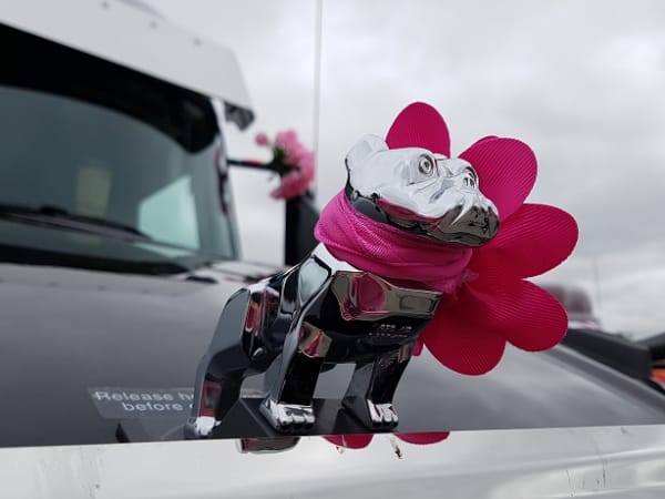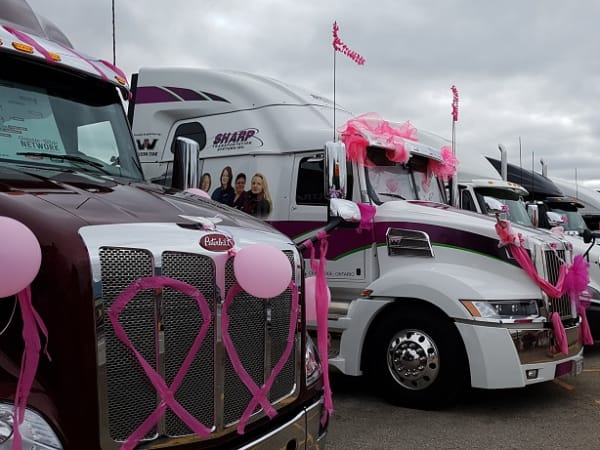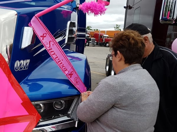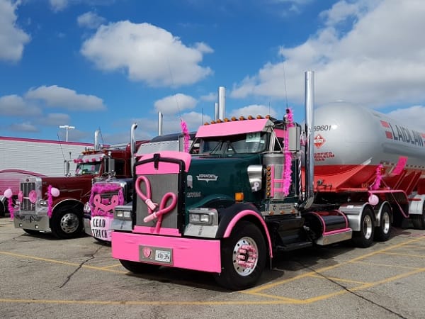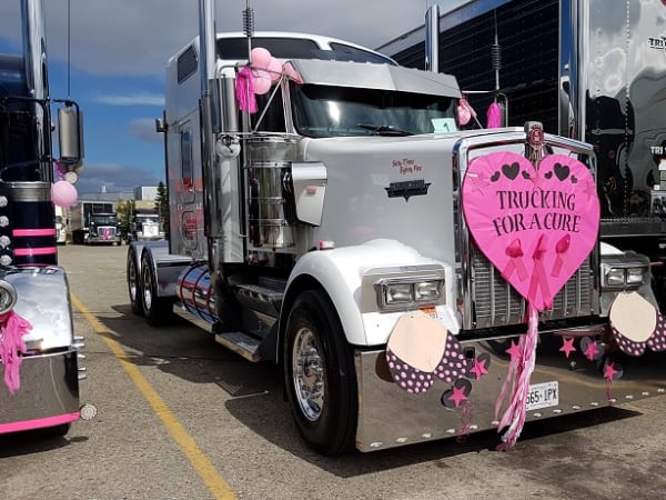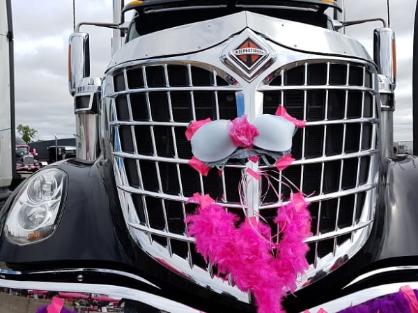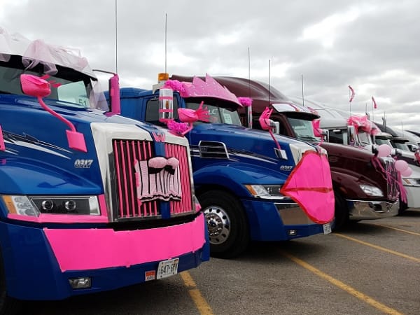 Drivers participating in the Trucking for a Cure Convoy decorate their trucks eye-catching "breast-cancer-pink" paraphernalia.